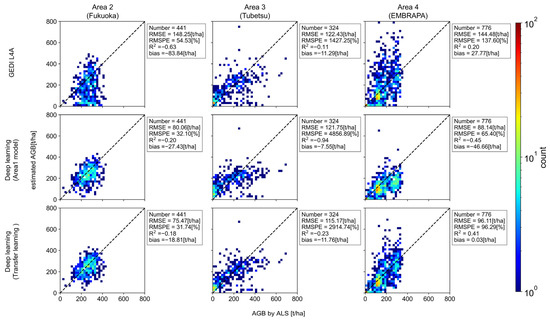 Figure 11 shows the comparison between ground truth AGB, GEDI L4A AGB, and the AGB recalculated using our method for A2 to A4. The results demonstrate that, similar to canopy height, the recalculated AGB values using the RH metrics derived from our method’s estimated ground elevation exhibited a smaller RMSE with respect to the ground truth AGB, thereby improving AGB estimation accuracy over the GEDI L4A AGB. Specifically, in the needleleaf-planted forests in the warm site (A2), the GEDI L4A AGB was underestimated, while in the tropical forest site in South America (A4), it was overestimated. These estimation errors were improved solely by the deep learning approach of this study. Considering the effect of transfer learning, AGB estimation accuracy improved slightly in A2 and the boreal site (A3) but not in A4.