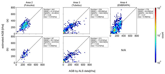 Figure 13 shows the results of recalculating AGB using RH metrics derived without ground elevation estimation error, the same as Figure 10. This figure also shows a comparison between AGB calculated using equations and parameters optimized based on local vegetation data (rather than the MODIS PFT used in GEDI L4A) and the ground truth AGB. Since no local vegetation information was available for the tropical forest site in South America (A4), the items related to Figure 13b are not shown for this region. In needleleaf-planted forests in the warm site (A2), the RMSE improved over Figure 11, but no significant improvements were observed in the boreal site (A3) or the tropical forest site in South America (A4). Even when the equations and parameters used for AGB calculation were optimized with local data, there were no significant improvements in either needleleaf-planted forests in the warm site (A2) or the boreal site (A3).