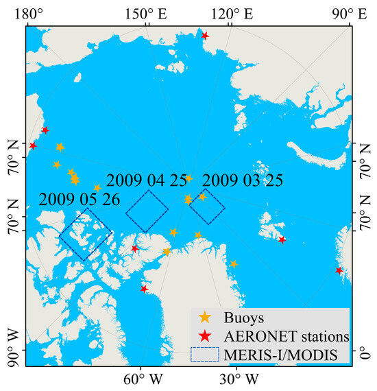 The locations of the AERONET stations (red stars), buoys (yellow stars), and MERSI-I/MODIS images (blue rectangles) in the Arctic. Because of the movement of the buoys, the yellow stars may represent the same buoy at different times. The MERSI-I/ MODIS images are not the complete scenes, and only the overlapping areas between the two sensors are presented.