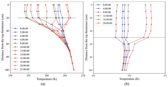 Temperature profiles in the snow and sea ice measured by the thermistor string installed in a CRREL buoy device. The colored lines denote the observation times. The dotted line denotes the snow–air interface. The data are from (a) 18 April 2010, and (b) 3 June 2011.