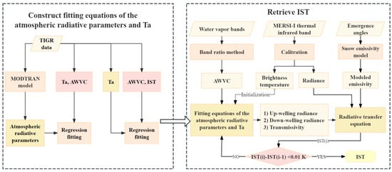 The flowchart of the developed ISC algorithm is made up of two parts (Figure 3). The first part is the construction of the fitting equations for the atmospheric radiative parameters and the effective mean atmospheric temperature (Ta). The TIGR data and MODTRAN model are used to simulate the atmospheric radiative parameters under different atmospheric situations. The AWVC, IST, and Ta can be obtained from the TIGR data [10]. Two regression fitting equations are used for the fitting of the atmospheric radiative parameters and Ta. The Ta and AWVC (pink box) are used to fit the atmospheric radiative parameters (yellow box). The AWVC and IST (pink box) are used to fit Ta (yellow box). Details of the construction of the fitting equations are presented in Section 3.5.