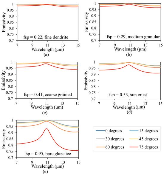 Figure 4a–e show the modeled emissivity values of different ice and snow types in the TIR wavelength range of 7–15 μm. The colored lines represent the different emergence angles. According to Figure 4, the ice and snow emissivity increased with wavelengths between 7 and 11 μm and peaks at 11 μm. In addition, the ice and snow emissivity decreased with the increase in the emergence angle. A comparison of the different subfigures shows that the emissivity decreased with the , given the same wavelength and emergence angle.