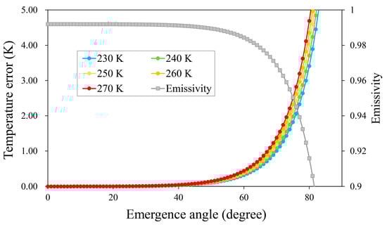 Figure 5 shows the simulated surface emissivity variation with the emergence angle for sun crust type ( = 0.53) and the IST error resulting from the emissivity variation. In addition to the emissivity, the IST error also varies with the IST because Planck’s equation is a non-linear equation. Therefore, we calculated the error caused by the emissivity at different temperatures (colored lines). According to Figure 5, the IST error increased with the increase in the emergence angle. The variation in IST error was negligible when the emergence angle was less than 40 degrees, the IST error then increased slowly from 40 to 70 degrees, which was followed by a sharp rate of increase from 70 to 90 degrees. Given the same emergence angle, a higher IST will lead to a higher IST error. The temperature error is 1–1.5 K at the emergence angle of 70 degrees. Therefore, it is necessary to correct the surface emissivity influence in order to achieve accurate results from the proposed algorithm.