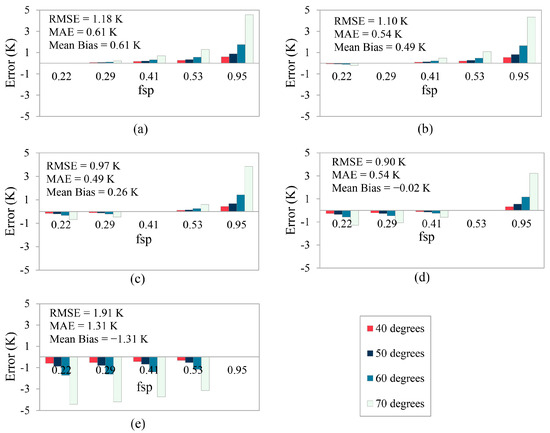 According to Figure 5, the error is very small when the emergence angle is smaller than 40 degrees. Therefore, emergence angles of 40, 50, 60, and 70 degrees were adopted. In addition, only the IST of 260 K was adopted because the IST has no influence on choosing the best surface type. In fact, when the IST error was calculated using IST values of 220 K, 240 K, 260 K, and 280 K, the smallest error using any IST value was associated with the sun crust type. Figure 6a–e show the IST error when the IST was retrieved using the emissivity of each of the following five types: fine dendrite, medium granular, coarse grained, sun crust, and bare glaze ice, respectively. The values on the x-axis represent the different ice and snow types. The y-axis is the IST error. In Figure 6a, the error for the fine dendrite ( = 0.22) was zero because we used the emissivity of the fine dendrite as the surface emissivity to retrieve the IST. According to Figure 6, the best accuracy was achieved with the sun crust type ( = 0.53). The worst accuracy was achieved for the bare glaze ice type ( = 0.95). Therefore, the sun crust type was adopted as the standard surface type for the IST retrieval.