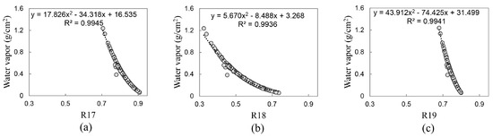 Scatter plots of the simulated AWVC and band ratios: (a)–(c) scatter plots of AWVC and band ratios , , and , respectively. is the band ratio of band i and band 16 (i = 17, 18, and 19).