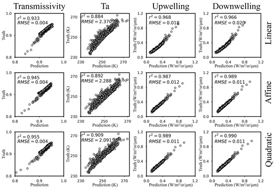 Scatter plots of the predictions and ground truths for four parameters (transmissivity, , atmospheric upwelling radiance, and downwelling radiance) based on the different fitting equations (linear, affine, and quadratic). The coefficient of determination (R2) values of the different scatter plots are listed in the subfigures.