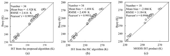 Scatter plots of the ISTs from buoy data against the retrieved ISTs: (a) proposed algorithm; (b) ISC algorithm; (c) MODIS IST product.
