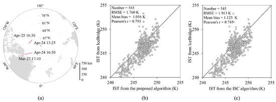Comparison with the IST from the IceBridge measurements; (a) locations of the comparison points; (b) comparison between the IST from the proposed algorithm and the IST from the IceBridge measurements; (c) comparison between the IST from the proposed ISC algorithm and the IST from the IceBridge measurements.