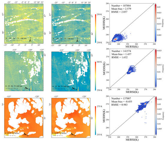 The scatter plots of the ISTs from MODIS and MERSI-I are also shown on the right side of the figure. According to Figure 11, the RMSEs were 2.857 K, 1.632 K, and 0.966 K for 25 March 2009, 25 April 2009, and 26 May 2009, respectively. The ISTs from MERSI-I were higher than the ISTs from MODIS on 25 March 2009 (mean bias = 2.579 K) and 25 April 2009 (mean bias = 1.457 K) but lower than the IST from MODIS on 26 May 2009 (mean bias = −0.455 K). Clearly, the mean bias decreased with the increase in the IST. In addition, the RMSE increases with the increase in the mean bias. This can be attributed to the difference in the surface emissivity used in the two retrieval algorithms. Neither algorithm adjusts the emissivity according to the ice and snow surface characteristics, although the surface characteristics and emissivity vary with the IST. According to Figure 5, a higher (lower) emissivity leads to a lower (higher) IST. Therefore, the mean bias varies with the IST. It should be noted that it is meaningless to compare the emissivity values used in the two algorithms because the spectral response functions of the TIR bands for the two sensors are different.