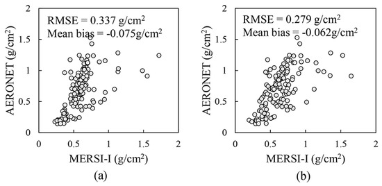 Scatter plots of the retrieved AWVC from MERSI-I and AERONET: (a,b) accuracy verification with and without including R19, respectively.