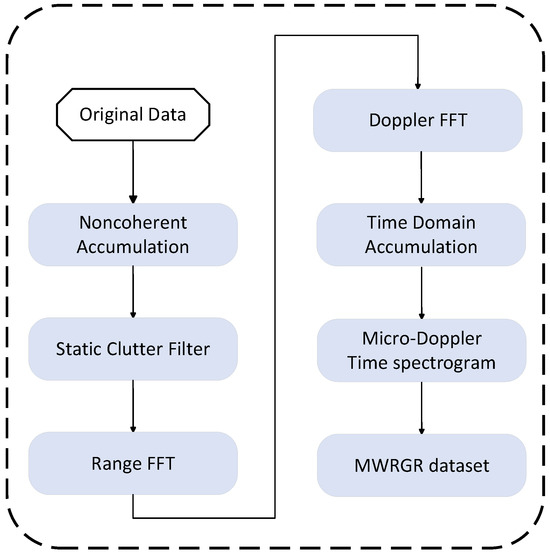 After collecting the echo data of the gesture, we processed it according to Figure 4. As shown in Figure 4, firstly, AWR1642 uses two transmitting antennas and four receiving antennas. From these receiving antennas, we extracted and analyzed the echoes of each gesture action, obtaining original data. Next, we combined the data from the four channels in a noncoherent manner. This method accumulates the amplitude information of the signal without considering the phase information of the signal. Then, we used a static clutter filtering module to remove static variables during the signal acquisition process while retaining dynamic variables containing gesture action information. Thirdly, a single frame was captured and then analyzed using a range FFT, which involved applying a fast Fourier transform to the column vectors of the collected data. Next, we applied the Doppler FFT to the outcome generated by the range FFT. This can obtain Doppler frequencies at different frames. Finally, we projected each frame onto the velocity dimension to generate the micro-Doppler time spectrogram.