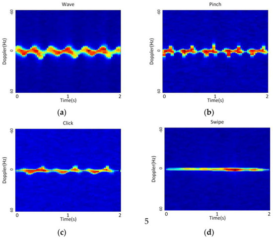 Figure 5 shows the samples of different gestures. The horizontal axis of each example is time, and the vertical axis is Doppler frequency. Here, all the gestures’ echoes were preprocessed using the above steps to construct the MWRGR dataset.