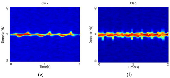 Examples of micro-Doppler time spectrogram. (a) Spectrogram of wave. (b) Spectrogram of pinch. (c) Spectrogram of click. (d) Spectrogram of swipe. (e) Spectrogram of circle. (f) Spectrogram of clap.