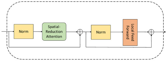 Figure 7 shows the structure diagram of the LPVT encoder. As shown in Figure 7, the transformer encoder primarily comprises a spatial reduction attention (SRA) layer and a local feedforward network [28]. The SRA layer enables the network to concurrently focus on information from various representational subspaces, enhancing its ability to capture more comprehensive details. In addition, the SRA layer reduces the number of key and value pairs in the attention layer compared to the multi-head attention layer of ViT, which greatly reduces the amount of computation. The output through SRA goes through a normalization layer before entering the local feedforward layer. The local feedforward network integrates locality into the system, enhancing the capture of detailed and continuous features within the feature map.