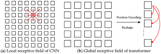 Figure 8a,b, respectively, show the local receptive field in CNN and the global receptive field in a transformer. As shown in Figure 8, the CNN convolution operation only aggregates local domain information, while the global self-attention mechanism carried by the transformer fuses the global information of the image. To ensure that the network emphasizes local continuity within the image while maintaining a broad global receptive field, we strategically integrated local features into the feedforward network of the transformer encoder, as shown in Figure 9. It allowed for a balanced focus on both local and global information.