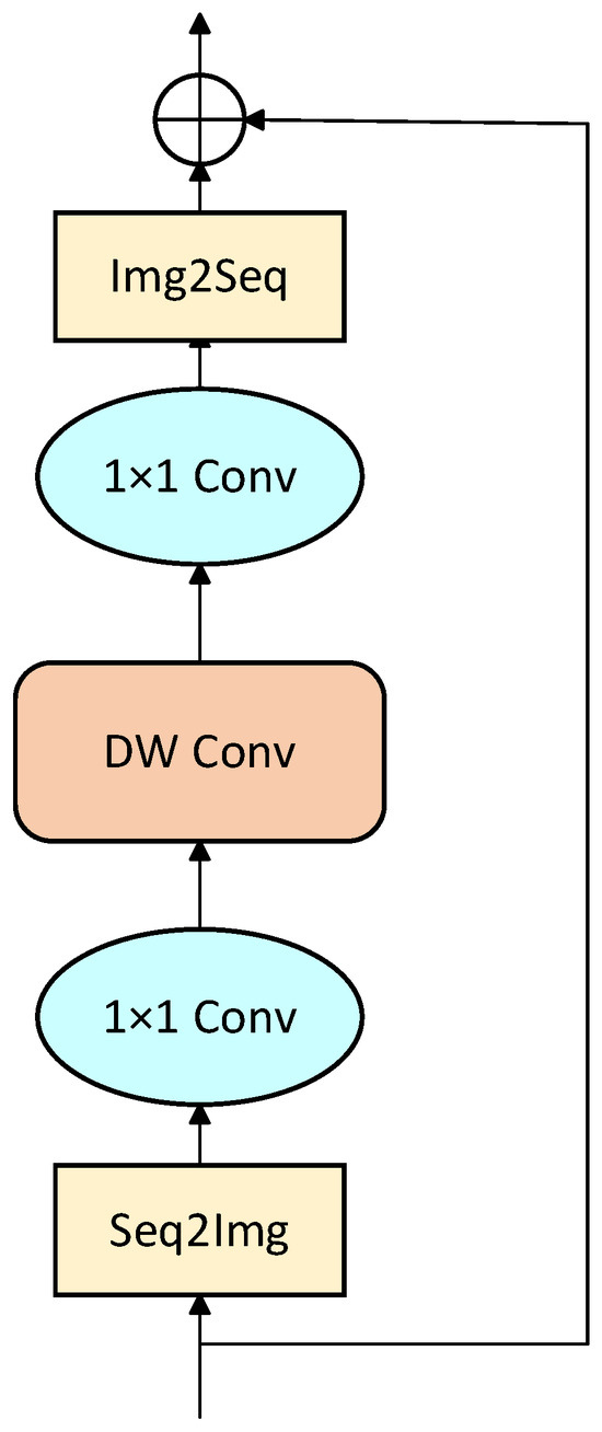 where and represent the convolution kernels of 1 × 1. represents a 3 × 3 convolutional kernel. The dimension expansion ratio γ is typically configured to 4. Additionally, the Img2Seq layer is tasked with converting the received data into a sequence format for subsequent processing in the self-attention layer.