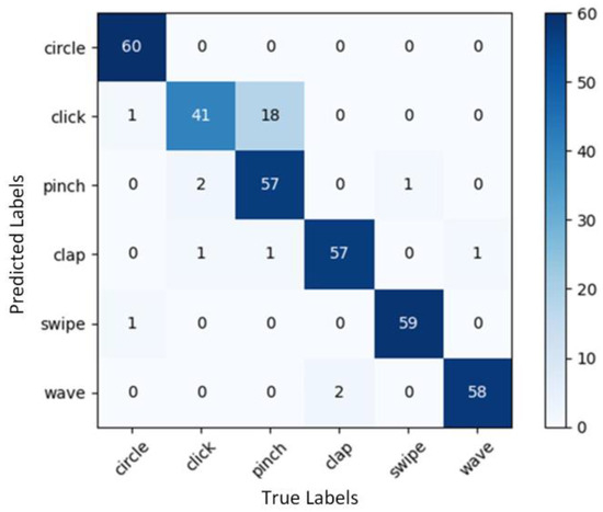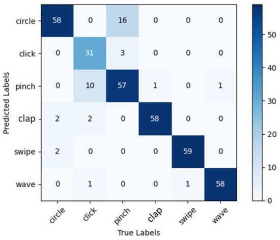 In order to evaluate the experimental results scientifically and clearly, several evaluation criteria were used to further demonstrate the performance of the proposed method. The confusion matrix of the proposed method is shown in Figure 11. To demonstrate the effectiveness of the proposed DropKey module, we also conducted experiments on LPVT without DropKey using a confusion matrix, as shown in Figure 12. The experimental results show that the algorithm has good performance in gesture recognition. For most gesture actions, the proposed network can achieve precise recognition. But, the recognition of click and pinch actions is poor, which may be due to the similarity of click and pinch actions in the MWRGR dataset. For minor actions, the micro-Doppler time spectrogram shows no substantial difference, which can lead to errors in the recognition process.