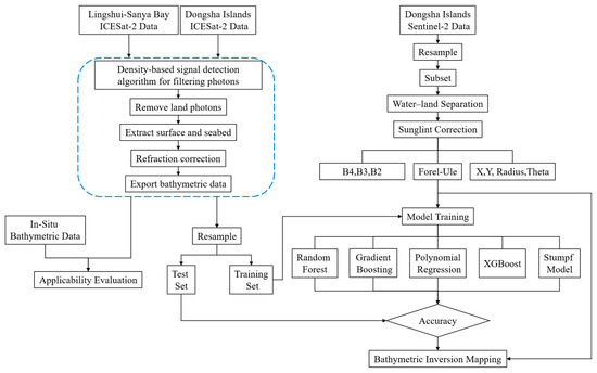 The main work of this study involves the following aspects: First, bathymetric measured data from Lingshui-Sanya Bay, as well as ICESat-2 data and Sentinel-2 images from both Lingshui-Sanya Bay and Dongsha Islands, were obtained. Second, Sentinel-2 images of the two study areas were preprocessed, and ICESat-2 bathymetric photon signals were extracted using a fully automated script. In the Lingshui-Sanya Bay area, ICESat-2 bathymetric photon data were matched with measured bathymetric data in terms of coordinates to evaluate the feasibility of ICESat-2 data for bathymetric applications. Subsequently, ICESat-2 bathymetric photon data from Dongsha Islands were resampled to a 10 m resolution and matched with Sentinel-2 images to obtain the red, green, and blue band reflectance values of the ICESat-2 bathymetric points. Additionally, the dataset was augmented with the FUI to represent water color information and spatial information, including normalized latitude and longitude coordinates as well as polar coordinates (radius and angle). Using this comprehensive dataset, the Stumpf model, Polynomial Regression model, Random Forest model, Gradient Boosting model, and XGBoost model were trained to invert the bathymetry of the Dongsha Islands. Finally, the accuracy and applicability of each model were comparatively evaluated. Figure 2 illustrates the technical workflow of this study.