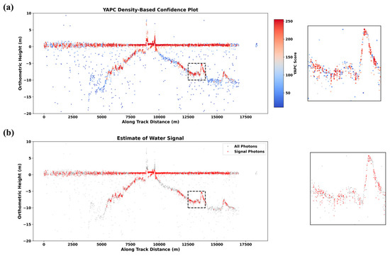 Noise and land photons were filtered using the YAPC algorithm. The right panel shows a zoomed-in view of the rectangular area in the image. (a) Photon signal density confidence map based on the YAPC algorithm, with red areas indicating high-confidence regions. (b) Water signal estimation map, where the red dots represent valid photon signals from the water surface and below.