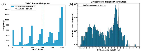 Reference lines for filtering noise and land photons. (a) The Otsu threshold method is used to automatically determine the minimum threshold for valid photon signals, with the red vertical line representing the threshold line for valid photon signals. (b) The estimated water surface height is obtained based on the histogram statistics of valid photon signals along the track, with the vertical black line indicating the estimated water surface height.