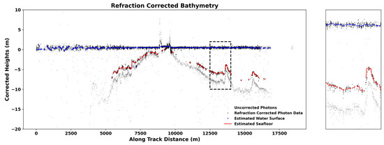 Water depth map after refraction correction. The gray points represent uncorrected photon data, while the black points indicate refraction-corrected photon data. The blue points denote estimated water surface photons, and the red line represents the estimated seafloor.