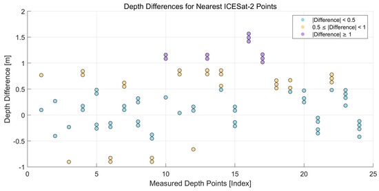 Difference distribution map showing the distribution of depth differences between the measured points and the nearest ICESat-2 bathymetry points. The X-axis represents the sequence number of the measured points.