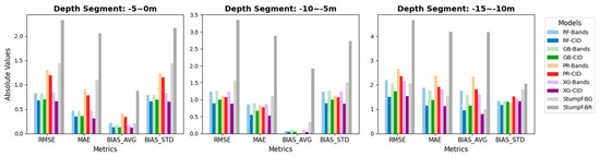 To further evaluate the predictive performance of the models, residual and bias distribution plots were generated (as shown in Figure 9). Statistical analysis was performed for three depth ranges: from −5 m to 0 m, from −10 m to −5 m, and from −15 m to −10 m. The root mean square error (RMSE), mean absolute error (MAE), bias average (BIAS_AVG), and bias standard deviation (BIAS_STD) for each depth range were calculated (as shown in Table 4). Additionally, bar charts of the performance evaluation metrics for each model across different depth ranges were plotted (as shown in Figure 10) to provide a comprehensive comparison of model performance at various depth intervals. RMSE and MAE reflect the predictive accuracy of the models, with lower values indicating smaller prediction errors within the depth ranges. BIAS_AVG and BIAS_STD reveal the bias in model predictions, with a lower BIAS_AVG indicating predictions closer to the true water depths and a smaller BIAS_STD suggesting higher stability in the model’s performance across different depth ranges.