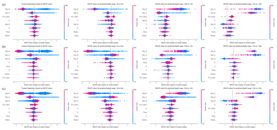 SHAP analysis of feature contributions across depth intervals. The leftmost plot in each group represents the overall analysis, covering feature contribution analysis across all depth intervals, while the remaining plots correspond to different depth intervals. (a) Random Forest-CID. (b) Gradient Boosting-CID. (c) XGBoost-CID.