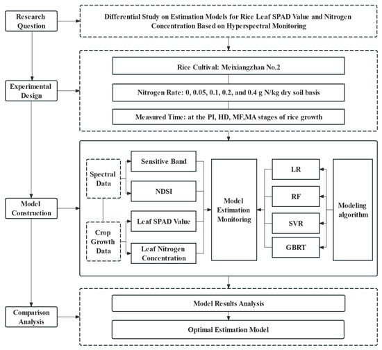 Rice (Oryza sativa L.) is one of the essential food crops, and more than 50% of the population consumes rice as their staple food; therefore, rice is a significant component in the food system [1]. Nitrogen is a primary element in the synthesis of chlorophyll [2], which is important for converting light energy into chemical energy [3]. Therefore, there is a connection between the leaf nitrogen concentration (LNC) and chlorophyll content, yet they also differ. The measurement of chlorophyll content usually requires destructive sampling, while the chlorophyll meter is a non-destructive measuring tool that is easy to operate and can measure the chlorophyll content without damaging the plant. A large number of studies indicates that the leaf soil and plant analyzer development (SPAD) value can indirectly reflect the chlorophyll content of crops [4,5,6]. In practical production, leaf SPAD value is commonly used to characterize the chlorophyll or nitrogen concentration of plants [7], and these values increase with the application of nitrogen fertilizers [8]. Although the trends of leaf SPAD value and LNC are similar, there are few reports on the quantitative differences in leaf SPAD value and LNC based on spectral technology.