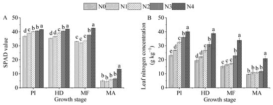 Effects of different nitrogen fertilizer levels on the leaf SPAD value and leaf nitrogen concentration (LNC) of rice at various growth stages. (A) Represents the leaf SPAD value, (B) represents the leaf nitrogen concentration, PI denotes the panicle initiation stage of rice, HD denotes the heading stage, MF denotes the middle stage of grain filling, and MA denotes the mature stage. N0, N1, N2, N3, and N4 indicate treatments of 0, 0.05, 0.1, 0.2, and 0.4 g N/kg dry soil basis, respectively. Lowercase letters for the same growth stage under different nitrogen fertilizer levels indicate significant differences at the p < 0.05 level.