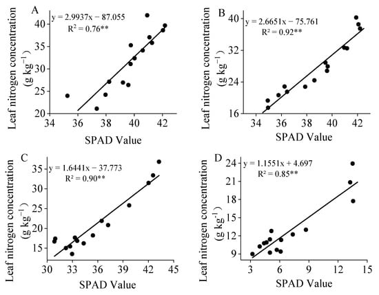 Linear regression of leaf SPAD value with leaf nitrogen concentration (LNC) at the PI (A), HD (B), MF (C), and MA (D) stages, respectively. R2 indicates the correlation coefficient between leaf SPAD and leaf nitrogen concentration. ** Indicates a significant difference at the p < 0.01 level.