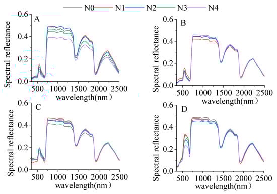 Spectral reflectance of rice leaves at the PI (A), HD (B), MF (C), and MA (D) stages. N0, N1, N2, N3, and N4 represent treatments of 0, 0.05, 0.1, 0.2, and 0.4 g N/kg dry soil basis, respectively.