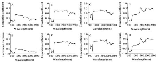 Correlation coefficients between leaf SPAD value and leaf nitrogen concentration (LNC) and spectral reflectance at various growth stages. The horizontal lines in the figure represent a correlation coefficient of −0.6. (A–D) Represent the correlation analysis between leaf SPAD value and spectral reflectance; and (E–H) represent the correlation analysis between leaf nitrogen concentration and spectral reflectance, where (A,E) represent the PI stage; (B,F) represent the HD stage; (C,G) represent the MF stage; and (D,H) represent the MA stage.