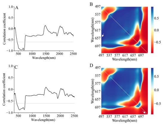 Correlation coefficients between spectral reflectances and randomly constructed NDSI in four key growth stages and leaf SPAD value and leaf nitrogen concentration (LNC): (A,C) Represent the correlation analyses between the spectral reflectances and the leaf SPAD value and leaf nitrogen concentration over the whole growth periods, respectively. The horizontal lines in the figure represent a correlation coefficient of −0.6. (B,D) Represent the correlation analyses between the randomly constructed NDSI values and the leaf SPAD value and leaf nitrogen concentration, respectively.