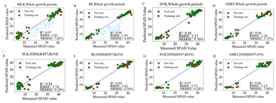 Prediction of leaf SPAD value on the basis of the reflectance throughout the whole growth period and NDSI (R497, R654). (A–D) Represent the predictions of leaf SPAD value by models based on reflectance throughout the whole growth period, and (E–H) represent the predictions of leaf SPAD value by models based on the NDSI. (A,E) Are LR models; (B,F) are RF models; (C,G) are SVR models; and (D,H) are GBRT models.