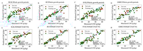 Prediction of leaf nitrogen concentration based on the reflectance throughout the whole growth period and NDSI (R729, R730) models. (A–D) Represent the predictions of leaf nitrogen concentration by models based on reflectance throughout the whole growth period, and (E–H) represent the predictions of leaf nitrogen concentration by models based on the NDSI. (A,E) Are LR models; (B,F) are RF models; (C,G) are SVR models; and (D,H) are GBRT models.