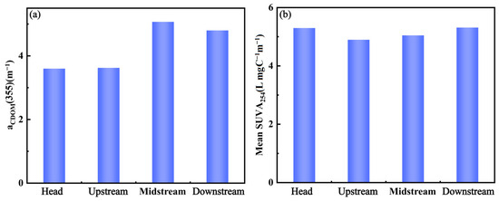 Distribution of aCDOM(355) (a) and SUVA254 (b) along Songhua River.