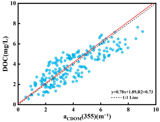 Based on the laboratory analysis of field samples, the mean DOC concentration in the Songhua River was 4.12 ± 1.57 mg/L, with a range of 0.55 to 7.15 mg/L. There was a substantial linear association between the aCDOM(355) absorbance and DOC concentration at the 355 nm wavelength, and the linear model precision was good and consistent with earlier research. Based on the strong correlation between the absorption coefficient of colored dissolved organic matter at 355 nm (aCDOM(355)) and the concentration of DOC observed in field collections (R2 = 0.73, p < 0.01), an empirical linear model was developed to estimate the concentration of DOC. The empirical model is shown in Figure 3: