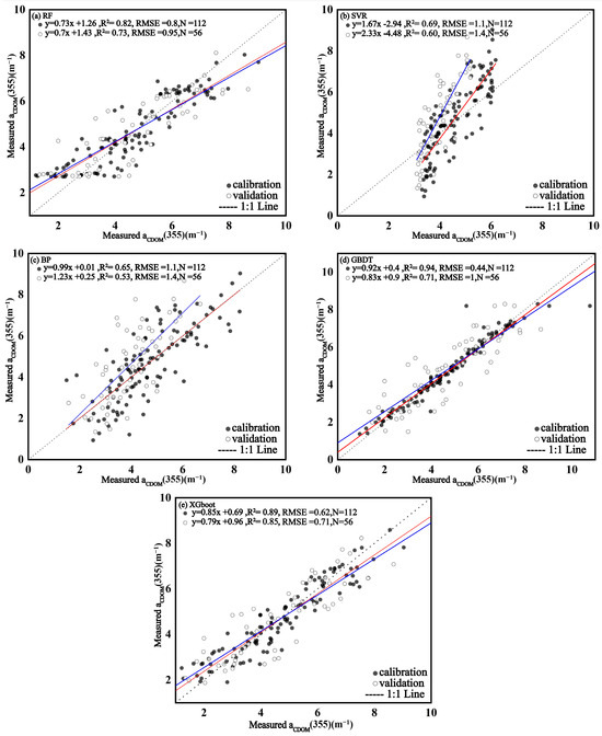 Calibration and validation of different algorithm models for aCDOM(355) in the Songhua River: (a) Random Forest (RF); (b) Support Vector Regression (SVR); (c) Back Propagation Neural Network (BP); (d) Gradient Boosting Decision Tree (GBDT); and (e) eXtreme Gradient Boosting (XGBoost).