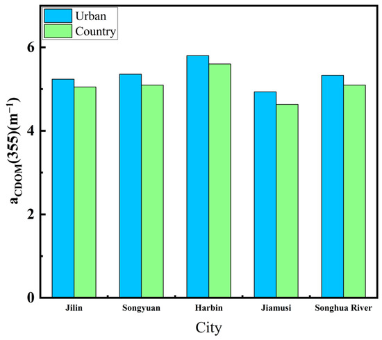 Annual mean values of aCDOM(355) in urban and non-urban sections of Songhua River flowing through each city.