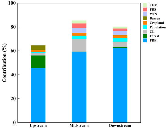 Contributions of various factors to CDOM in main stream of Songhua River (driving factors: PRE (precipitation); forest; CL (construction land); population; cropland; barren (land without vegetation); WIN (wind); PRS (pressure); and TEM (temperature)).