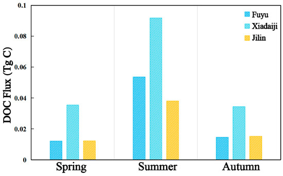 In this study, the DOC fluxes in different seasons at three stations (Fuyu, Xiaodaiji, and Jilin) on the main stream of the Songhua River, as well as the annual DOC fluxes at the Harbin station, were estimated using large river flow data released by the Information Center of the Ministry of Water Resources of China (MWRC). The DOC concentration fluxes are shown in Figure 10, where a significant variability in fluxes in different seasons can be observed, with the highest DOC fluxes at the Lower Daiji station in summer (0.0918 Tg C), followed by spring (0.0355 Tg C) and fall (0.0345 Tg C), DOC fluxes at the Fuyu station in summer (0.0536 Tg C), followed by fall (0.0145 Tg C) and spring (0.0122 Tg C), and DOC fluxes at the Jilin station (0.0381 Tg C), followed by fall (0.0152 Tg C) and spring (0.0123 Tg C). DOC fluxes were much higher at all the different sites during the summer than during the other seasons, and there was a significant negative linear relationship between flow and DOC concentration (R = −0.63) [57]. Organic carbon transported by rivers is mainly in the form of DOC, which can help in assessing the sources of organic carbon and carbon balance. Riverine organic carbon transport not only records the natural variability of a watershed, but also reflects the impacts of anthropogenic activities within the watershed. Rainfall, land use, human activity, and temperature are all factors that influence DOC concentrations in rivers. Harbin is located in the middle reaches of the Songhua River. The annual flux of DOC at the Harbin Station of the Songhua River is 0.2275 Tg C/Yr, which is higher than that of other cities. As the largest provincial capital city in Northeast China, Harbin’s industrial pollution emissions, urban emissions, and land use changes due to urbanization lead to the input of organic matter and nutrients, which affected the river carbon fluxes and ecological environment. These changes altered the content and distribution of organic matter in the Songhua River water bodies, affecting the future accuracy of carbon content estimation and carbon cycle process analysis. The correct understanding and consideration of these changes is necessary for accurate carbon flux estimation, and carbon cycle process analysis and the estimation of DOC fluxes based on stream classification will be undertaken in the future.