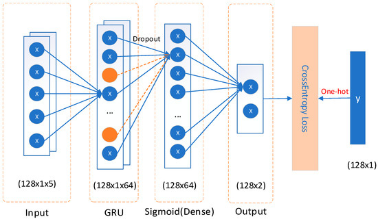 - The selection of hyperparameters: The model utilized binary cross-entropy loss, consisted of a single GRU layer with 64 hidden units, and was trained using the Adam optimizer with a learning rate set to 0.0001. Cross-entropy loss is a commonly used loss function in classification tasks of neural networks [37,38,39]. It measures the difference in information between two probability distributions and is commonly employed to evaluate the discrepancy between the neural network model’s predicted probability distribution and the true probability distribution. Binary cross-entropy loss is a special case of cross-entropy loss in binary classification problems. The formula of binary cross-entropy loss is as follows:where n is sample number, log is logarithmic function, is the label value (0 or 1), and is the predicted value. The smaller the value of , the better the model’s performance in identifying ground clutter.