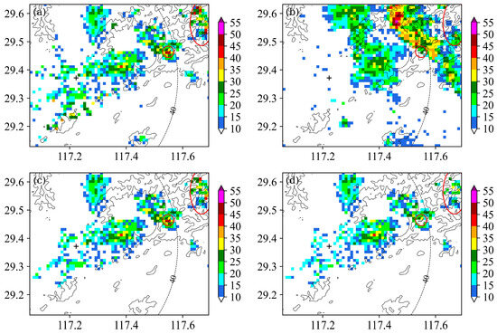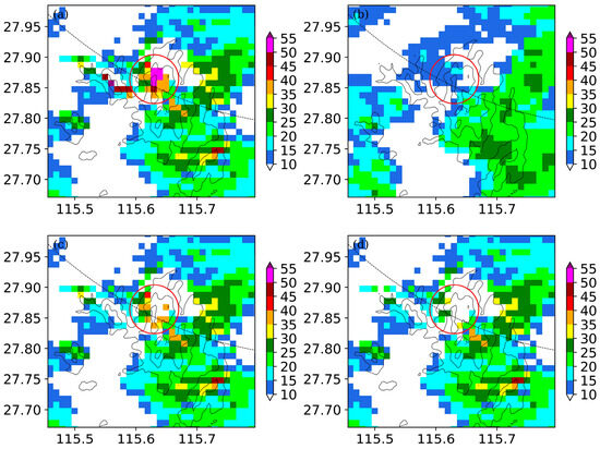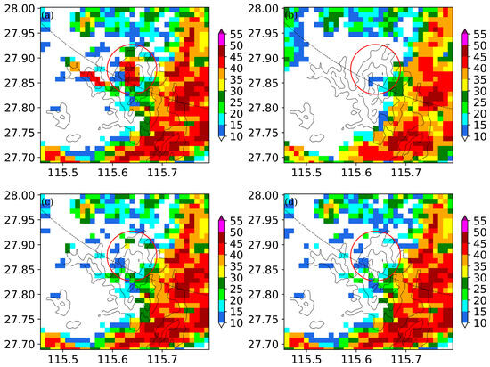 For the case that occurred at 0732 UTC on 1 June 2019, in the reflectivity field at a 0.5° elevation angle, some echoes with maximal reflectivity exceeding 40 dBZ appeared over Yuhuashan and its nearby area, accompanied by numerous weak meteorological echoes (Figure 1 and Figure 6a). However, there are only some weak echoes with reflectivity less than 15 dBZ in the reflectivity field at a 1.5° elevation angle (Figure 6b), with no echoes at the next upper layer (i.e., 2.4° elevation angle, not shown). Moreover, the strong echoes (>40 dBZ) exhibit clear edges and are mainly concentrated in high-altitude areas above 600 m (Figure 6a). Clearly, the strong echoes over Yuhuashan and its nearby area are ground clutter because of their short vertical extension. Figure 6c,d show the radar reflectivity fields in which ground clutter is removed by the traditional and GRU methods, respectively. The two methods identify and remove most of the ground clutter. However, in the reflectivity field processed by the traditional method (Figure 6c), some strong echoes with reflectivity exceeding 30 dBZ still remain over the main topography due to the presence of echoes at the 1.5° elevation angle (i.e., the echoes in the red circle in Figure 6b). In contrast, in the reflectivity field processed by the GRU method (Figure 6d), only some scattered weak echoes appear over the main topography and its nearby area. Clearly, the GRU method is more effective in capturing ground clutter than the traditional method in this event.