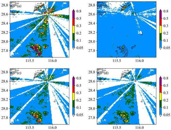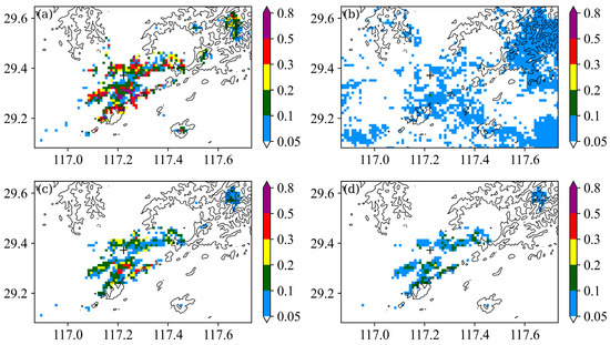 Figure 10 shows the frequency maps of the JDZ radar reflectivity exceeding 20 dBZ. Similarly to the NC radar, in the 0.5° elevation frequency map from the raw radar reflectivity (Figure 10a), there are many points with frequencies more than 0.2 or even 0.5 near the JDZ radar and mountains to the northeast of the JDZ radar. Meanwhile, the frequencies of raw radar reflectivity in the upper second layer (i.e., 2.4° elevation) are relatively small, with values below 0.1 (Figure 10b). Clearly, the high-frequency points near the JDZ radar and mountains in Figure 10a mainly result from ground clutter. After processing radar reflectivity at 0.5° elevation by the traditional method (Figure 10c), the points with high frequency are obviously reduced, but there are still a few points near the radar site with frequencies more than 0.5. In contrast, after using the GRU method to remove ground clutter, the frequencies in this study area are almost always less than 0.2, including the area near the radar site (Figure 10d). Moreover, the distributions of frequency greater than 0.05 in Figure 10c,d are consistent. Clearly, this further indicates that the GRU method has better performance than the traditional method to identify and remove ground clutter from the raw radar reflectivity.