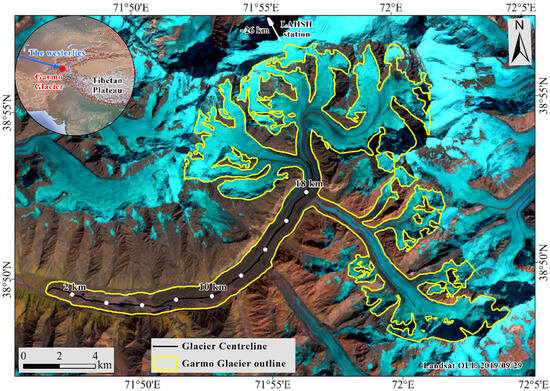 The Garmo Glacier (38°48′–38°56′N, 71°48′–72°04′E) (Figure 1), located in western Pamir, spans an extensive altitudinal range from 6712 m to 2976 m, with an area of 129.38 km2 and a length of 25.3 km [36]. As indicated by the latest inventory of surging glaciers, Garmo Glacier is classified as a surge-type glacier [32,37], with a significant surge event recorded in 2022 [33].