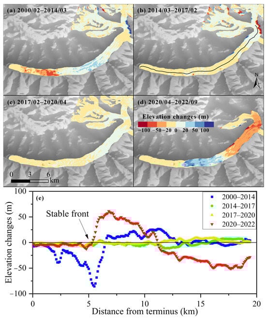 (a–d) Elevation changes of Garmo Glacier during 2000–2014, 2014–2017, 2017–2020, and 2020–2022; (e) surface elevation changes along the center line.
