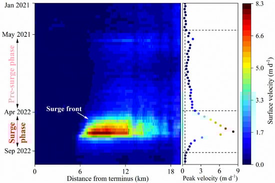 In May 2021, a noticeable acceleration in the surface velocity of Garmo Glacier marked the start of its pre-surge phase, with velocities reaching up to 1.4 ± 0.03 m d−1 (Figure 3). However, this initial acceleration subsided, and the glacier maintained a slow pace until spring 2022. On 27 April 2022, a pronounced acceleration signaled the onset of the surge phase, with average velocities exceeding 1.0 ± 0.03 m d−1 and peak velocities reaching 3.7 ± 0.03 m d−1. From 27 April to 26 June, the surge front advanced down-glacier, accompanied by a significant velocity increase (Figure 4). Although data on the instantaneous movement of surface bulges were not available, peak velocities reached 8.3 ± 0.03 m d−1 on 26 June, with velocities exceeding 7.0 ± 0.03 m d−1 between 7 and 12 km from the terminus, indicating a widespread area affected by the surge. Following this peak, a decline in glacier velocity began, with peak velocities decreasing to 6.2 ± 0.03 m d−1 on 8 July, 3.2 ± 0.03 m d−1 on 20 July, and down to 1.4 ± 0.03 m d−1 by mid-August. By September, the glacier velocity had returned to pre-surge levels, dropping below 1.0 ± 0.03 m d−1, signaling the end of the surge phase. This sequence of velocity changes highlights the dynamics and magnitude of Garmo Glacier’s surge event in 2022.
