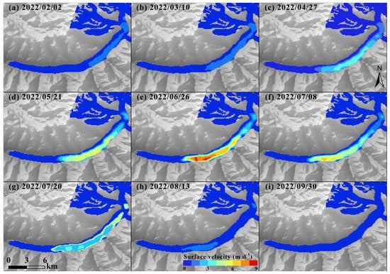 Temporal evolution of glacier surface velocity of Garmo Glacier from February 2022 to September 2022.