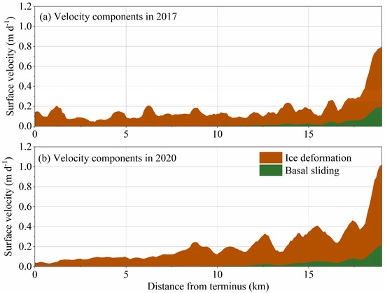 To investigate the surging mechanism of Garmo Glacier, we estimated its basal deformation velocity. In 2017 and 2020, the basal deformation velocities were approximately 0.17 m d−1 and 0.18 m d−1, which closely aligned with observed surface velocities of 0.19 ± 0.03 m d−1 and 0.23 ± 0.03 m d−1, respectively. This similarity suggests that the glacier’s motion was primarily driven by internal ice deformation, with minimal basal sliding, implying that the glacier bed was likely frozen and, thus, characterized by cold temperatures.